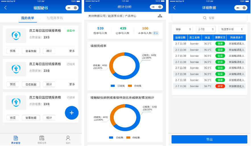 “填報秘書”小程序提供按照組織架構逐層匯總、自動統(tǒng)計、一鍵導出等功能,自動完成數(shù)據(jù)排查和統(tǒng)計匯總工作。同時,對重要信息進行實時監(jiān)控,能夠第一時間發(fā)現(xiàn)異常問題并預警。