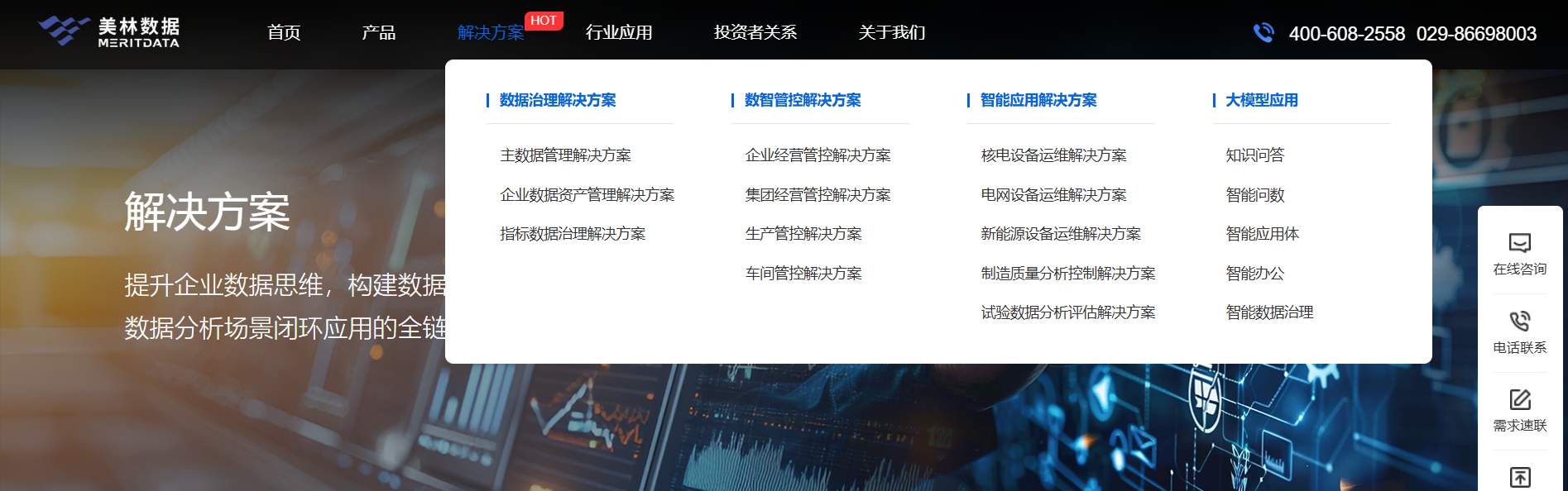 解決方案頁以“數(shù)據(jù)治理-數(shù)智管控-智能應用-大模型創(chuàng)新”為邏輯主線,形成公司