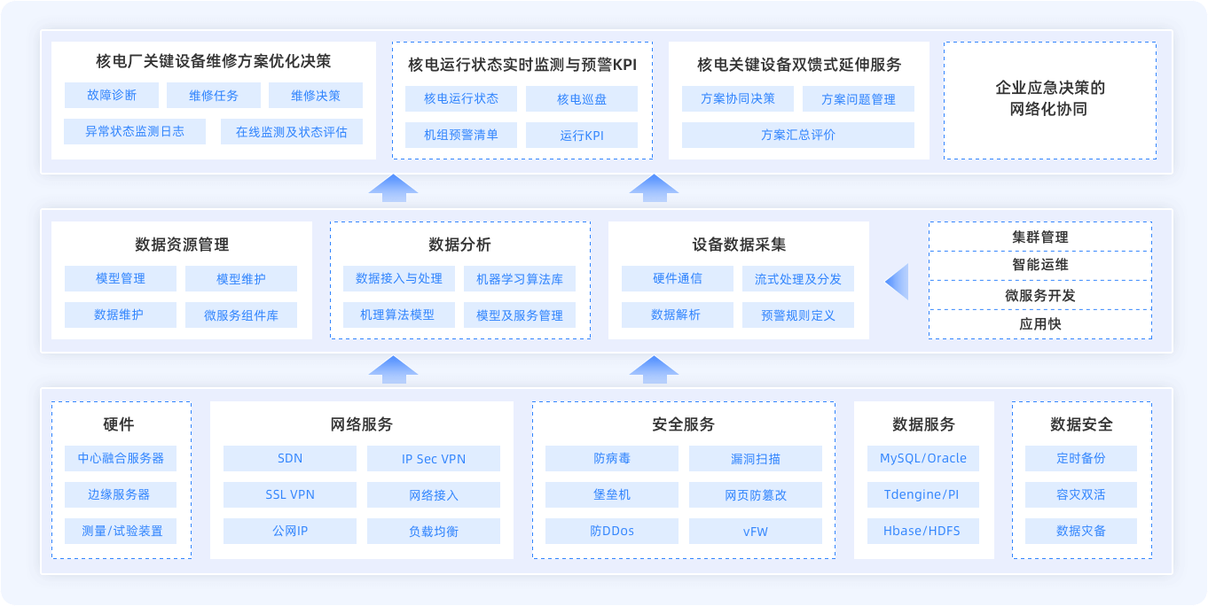 構(gòu)建面向機(jī)組實時運行監(jiān)控預(yù)警、設(shè)備雙饋式服務(wù)、維修應(yīng)急決策全面協(xié)同的一體化核電運維決策系統(tǒng)。通過設(shè)計、制造、運營、服務(wù)等多源異構(gòu)數(shù)據(jù)的全面存儲和管理,如電廠PI系統(tǒng)、IETM系統(tǒng)、便攜式終端、循泵試驗臺等集成,借助數(shù)據(jù)深度建模,實現(xiàn)對運行狀態(tài)的評估以及運維活動的實時決策優(yōu)化,實現(xiàn)設(shè)備故障從“被動反應(yīng)”到“主動預(yù)防”的模式轉(zhuǎn)變,提升企業(yè)生產(chǎn)運營的可靠性和安全性,助力提質(zhì)增效。