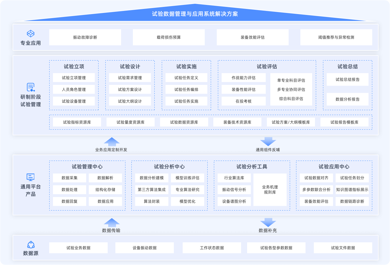 通過提供基于統(tǒng)一平臺(tái)的業(yè)務(wù)方案,可實(shí)現(xiàn)對(duì)試驗(yàn)數(shù)據(jù)的統(tǒng)一采集、解析、管理與分析支持,并對(duì)各產(chǎn)品積累的試驗(yàn)數(shù)據(jù)進(jìn)行深層次挖掘,獲取性能、強(qiáng)度、效能等學(xué)科知識(shí)和規(guī)律,支持反饋至研發(fā)部門和承制部門,閉環(huán)改進(jìn)產(chǎn)品設(shè)計(jì)、提高產(chǎn)品質(zhì)量可靠性,提升企業(yè)核心競(jìng)爭(zhēng)力。