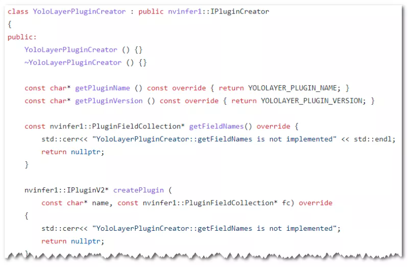 由于第一階段采用的檢測(cè)模型為Yolov4-tiny,而TensorRT中對(duì)其中的一些層的算子不支持,要生成優(yōu)化模型,需要結(jié)合DeepStream部署框架及TensorRT相關(guān)標(biāo)準(zhǔn),實(shí)現(xiàn)對(duì)應(yīng)IPluginV2和IPluginCreator的接口: