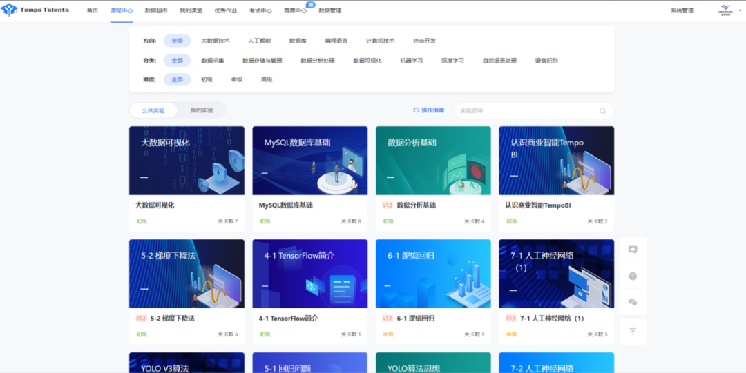 ?覆蓋多領(lǐng)域知識(shí)點(diǎn)的課程實(shí)驗(yàn) 課程實(shí)驗(yàn)旨在通過(guò)實(shí)踐操作來(lái)加深學(xué)生對(duì)理論知識(shí)的理解,并培養(yǎng)他們的實(shí)踐技能和解決問(wèn)題的能力。TT平臺(tái)圍繞高校的人才培養(yǎng)目標(biāo),以及大數(shù)據(jù)領(lǐng)域?qū)I(yè)人才能力需求,打造包含數(shù)據(jù)采集、數(shù)據(jù)存儲(chǔ)、數(shù)據(jù)分析、數(shù)據(jù)應(yīng)用等上千個(gè)覆蓋大數(shù)據(jù)領(lǐng)域技術(shù)知識(shí)點(diǎn)的課程實(shí)驗(yàn)。課程體系豐富多樣,從入門(mén)、熟練到精通應(yīng)用的落實(shí),專(zhuān)業(yè)系統(tǒng)的課程設(shè)計(jì)讓學(xué)生將每一個(gè)知識(shí)點(diǎn)吃透和掌握,全面培養(yǎng)學(xué)生應(yīng)用能力,提升綜合數(shù)據(jù)素養(yǎng)。