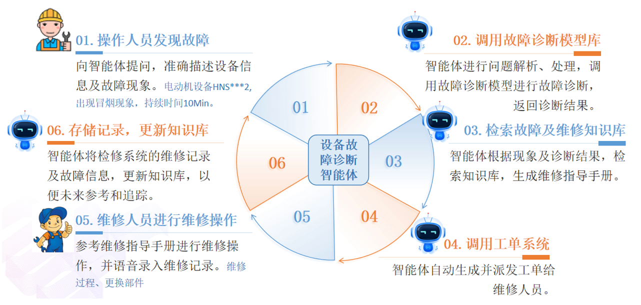 在設(shè)備故障診斷領(lǐng)域,為制造企業(yè)構(gòu)建了設(shè)備故障診斷智能體,大模型負(fù)責(zé)接收員工提出的設(shè)備故障的相關(guān)信息,并進行理解和任務(wù)規(guī)劃,故障診斷模型庫中的小模型負(fù)責(zé)各類故障的診斷,大模型再通過診斷結(jié)果調(diào)用知識庫獲取故障處理措施然后反饋給員工。